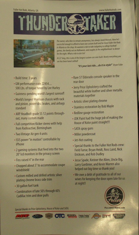 Now Hot Rod Magazine’s April, 2013 issue features it with a great story and pictorial.  http://www.hotrod.com/featuredvehicles/hrdp_1305_thundertaker_1960_cadillac_superior_coachworks_hearse/viewall.html