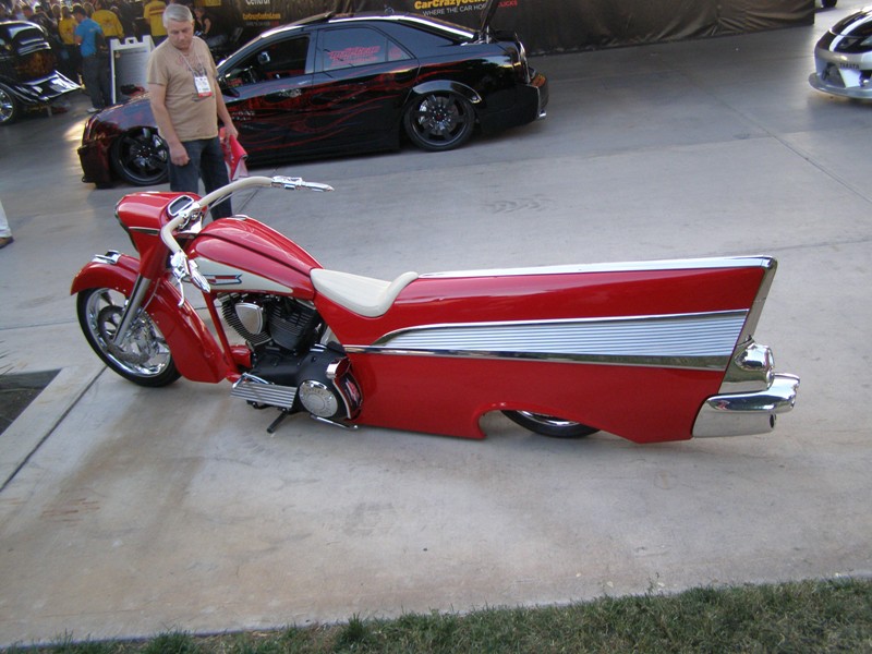 Take a 2008 Harley Davidson Dyna Street Bob motorcycle, add huge amounts of ingenuity, imagination and innovation and blend with over 3,000 hours of labor and you might end up with this homage to the ever popular 1957 Chevrolet Bel Air. This red beauty was seen at the SEMA (Specialty Equipment Marketing Association) show held in Las Vegas, Nevada last week.