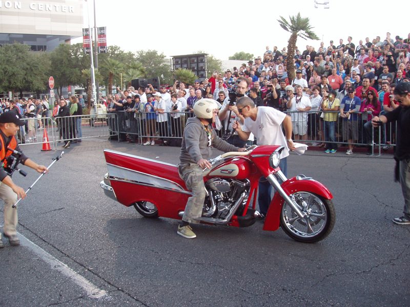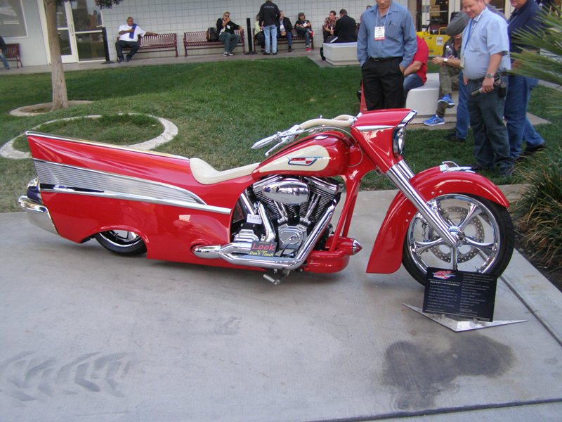 Take a 2008 Harley Davidson Dyna Street Bob motorcycle, add huge amounts of ingenuity, imagination and innovation and blend with over 3,000 hours of labor and you might end up with this homage to the ever popular 1957 Chevrolet Bel Air. This red beauty was seen at the SEMA (Specialty Equipment Marketing Association) show held in Las Vegas, Nevada last week.
