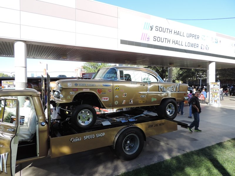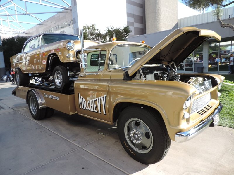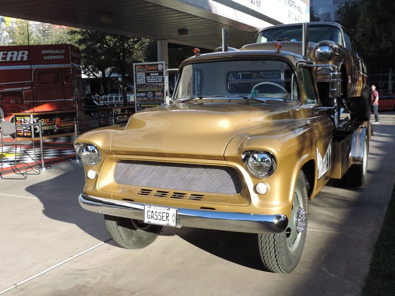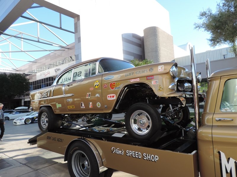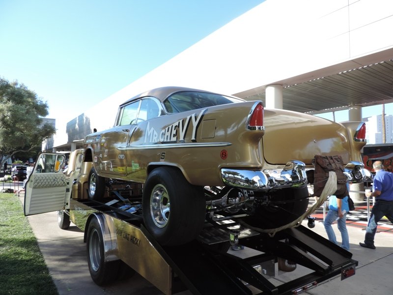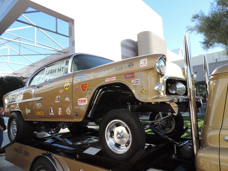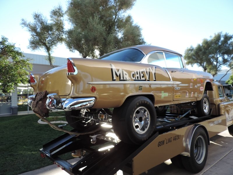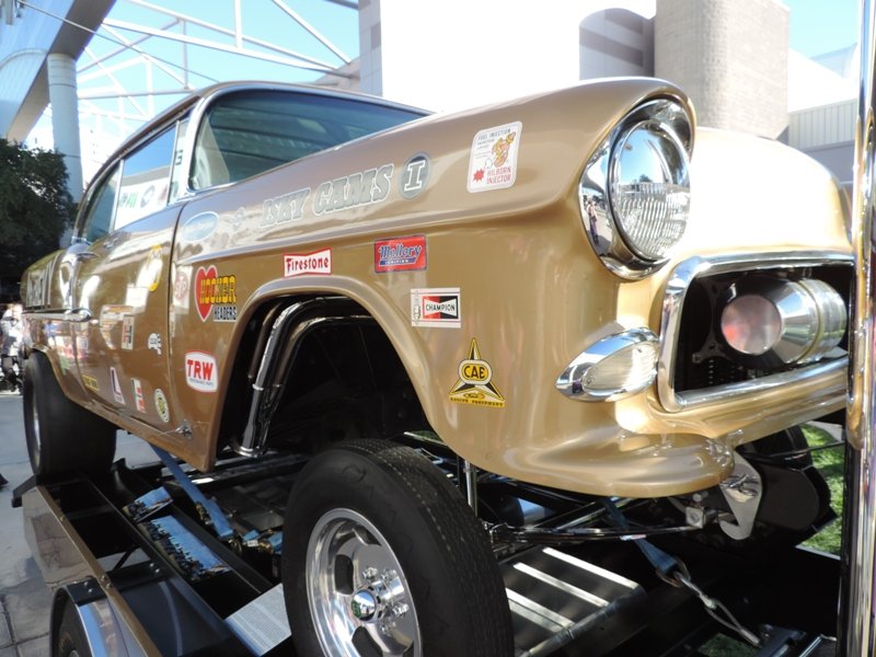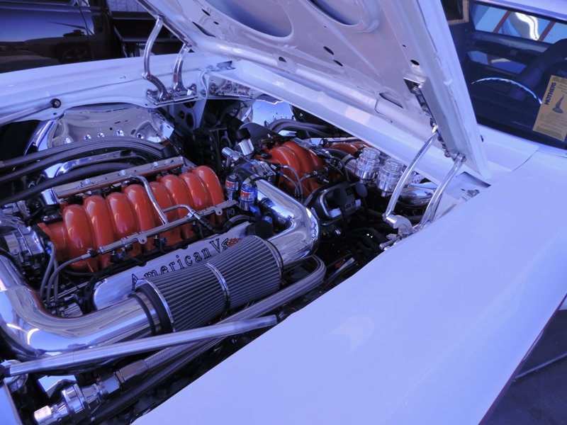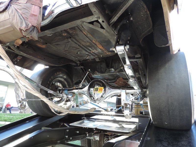 The interior sports white metallic diamond pleats. Hilborn injection was used for more power and classic Hooker headers were also used. That’s a fiberglass front end to help cut the weight on the shoebox Chevy. The pictures show the extensive amount of chroming that Heck used on this racer’s rear end suspension parts.